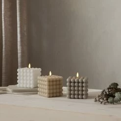 LED Kerze Bubble – Würfelkerze – Echtwachs – realistische 3D Flamme – H: 12,5cm – Timer – grau