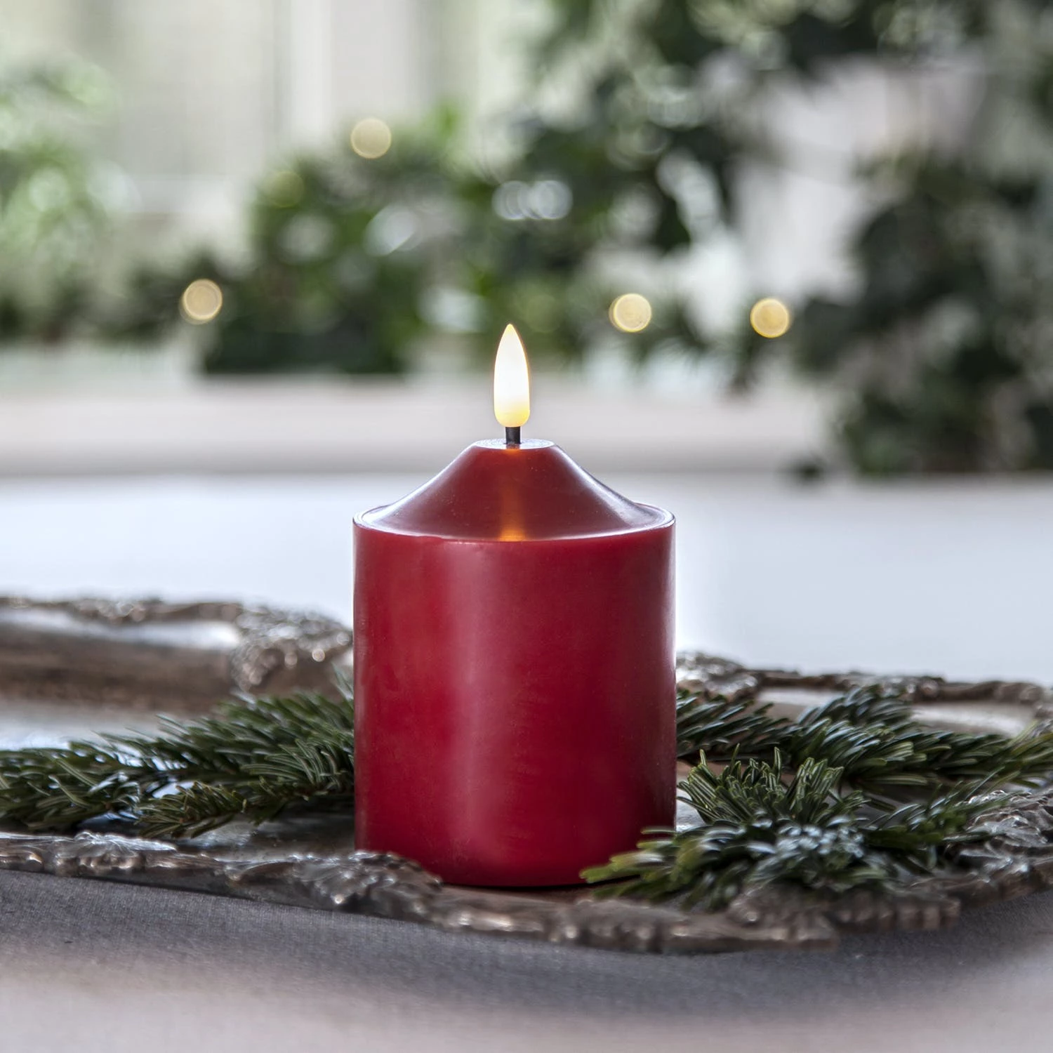LED Stumpenkerze Flamme – Echtwachs – warmweiĂe 3D Flamme – H: 12cm – Batteriebetrieb – Timer – rot