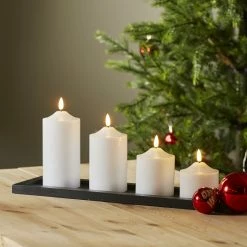 Diese Stumpenkerze leuchtet in einem realistischen gelblich-orangen Farbton. Die 3D Flamme zeigt ein leichtes Flackern, das eine romantische und gemütliche Atmosphäre erzeugt.