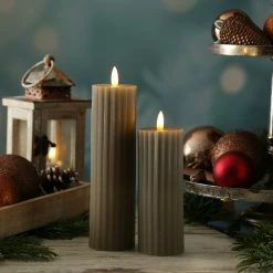 LED Kerze LIV – gerillt – Echtwachs – warmweiĂe 3D Flamme – H: 17,5cm – D: 5,5cm – Timer – taupe