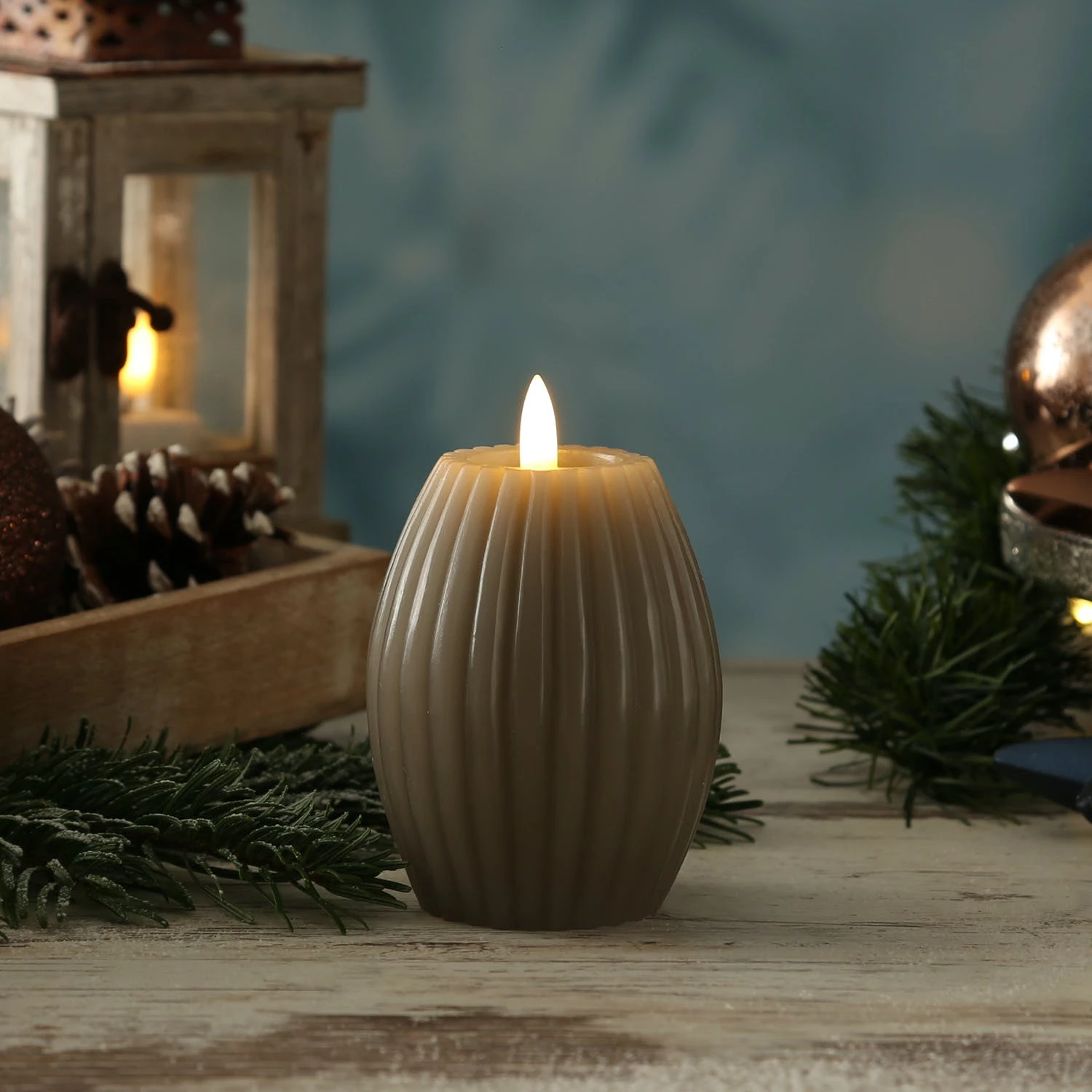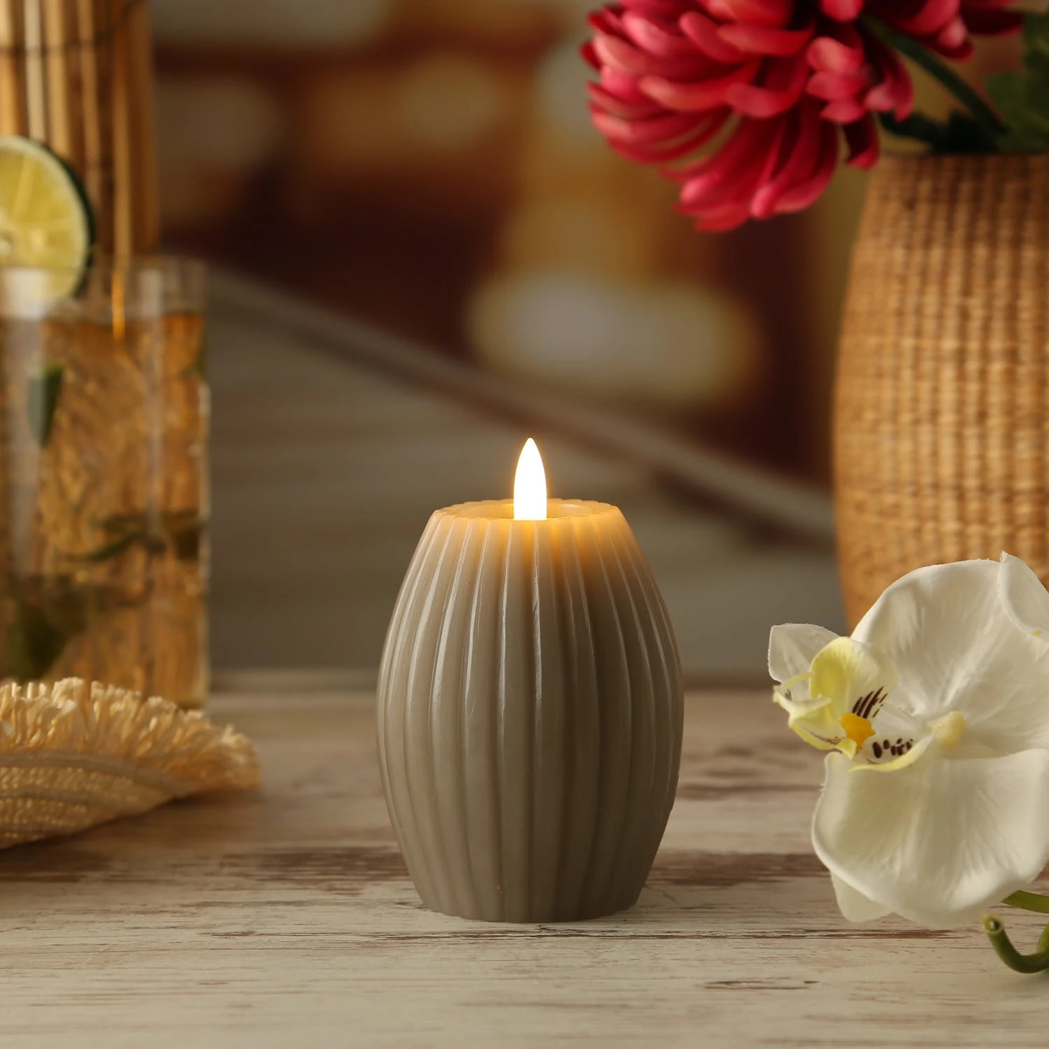 LED Kerze LIV – gerillt – Echtwachs – warmweiße 3D Flamme – H: 12cm – D: 8cm – Timer – taupe