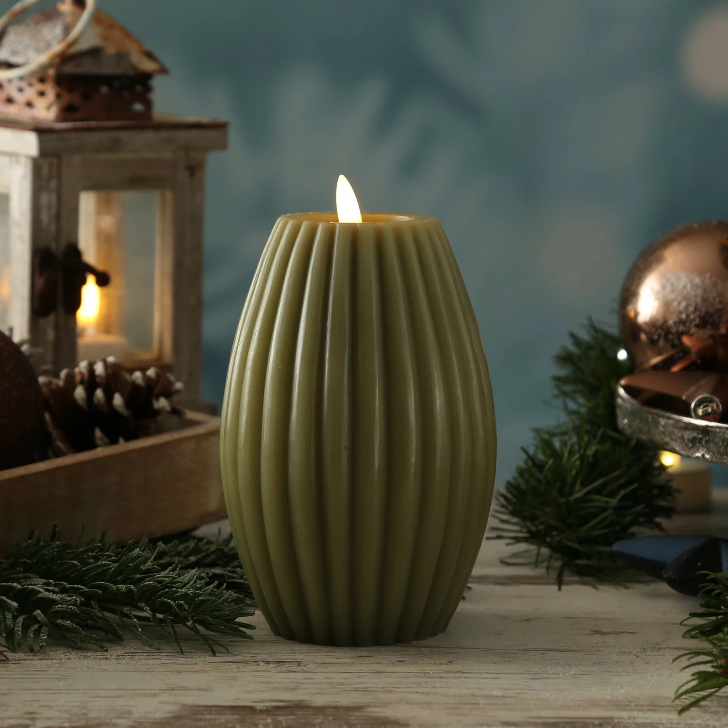 LED Kerze LIV – gerillt – Echtwachs – warmweiße 3D Flamme – H: 17cm – D: 10cm – Timer – grün