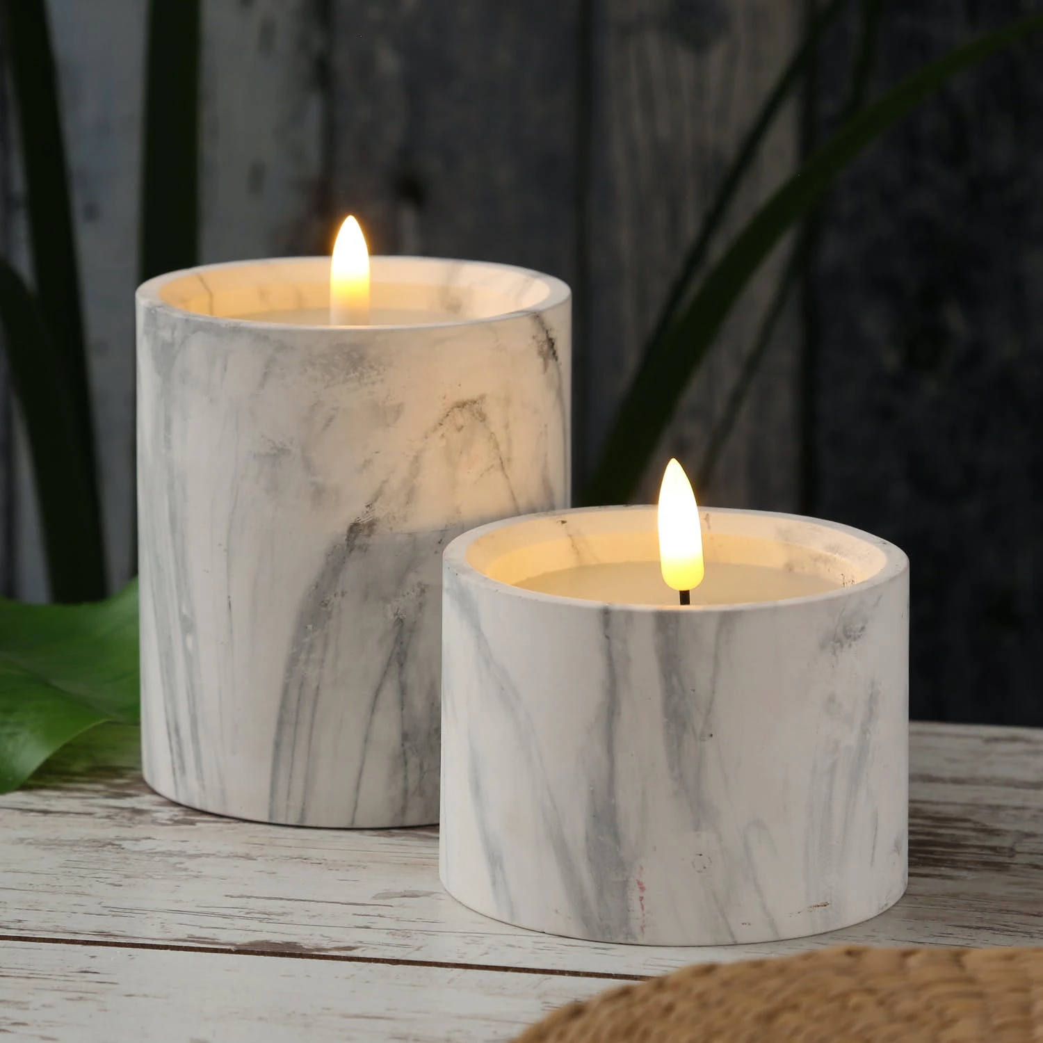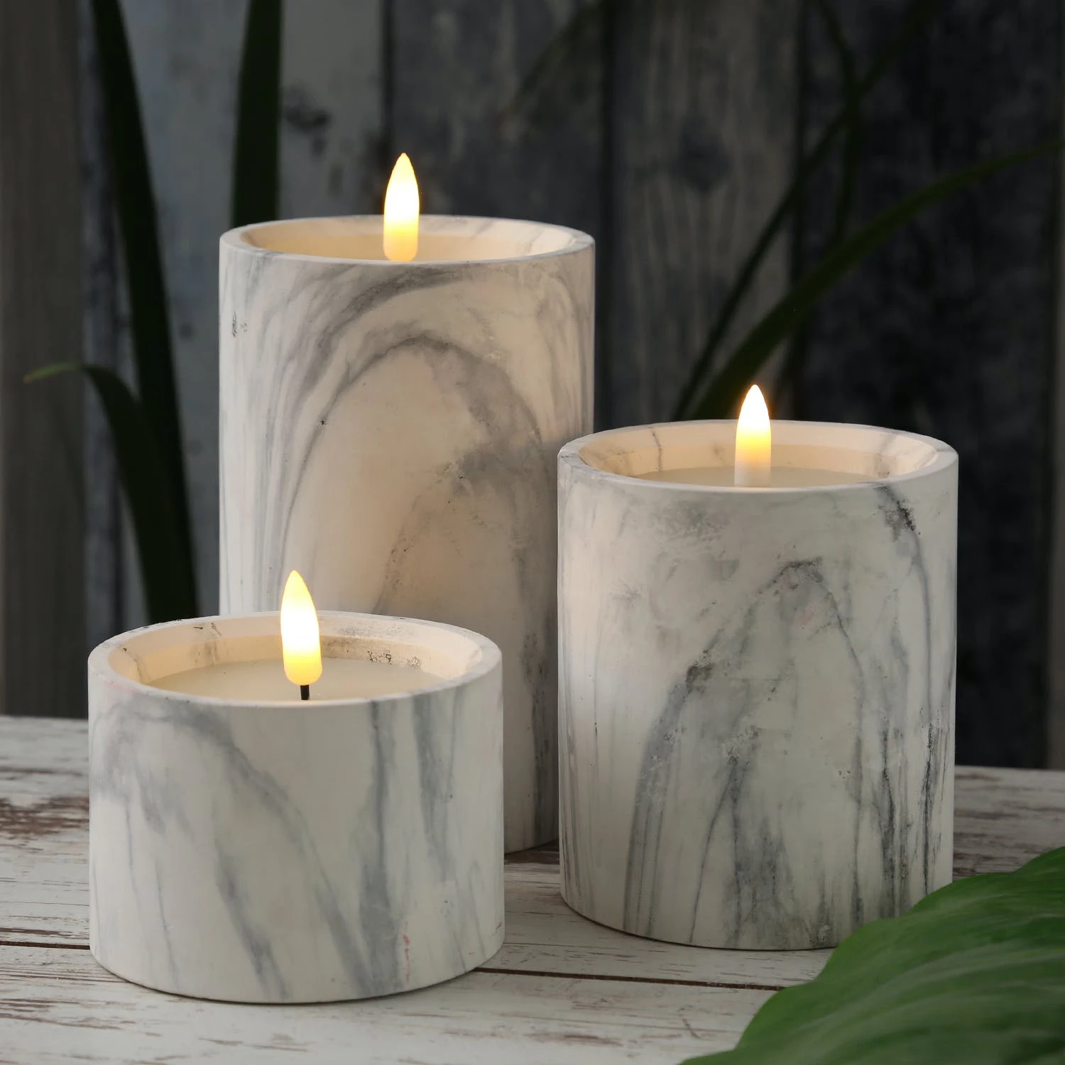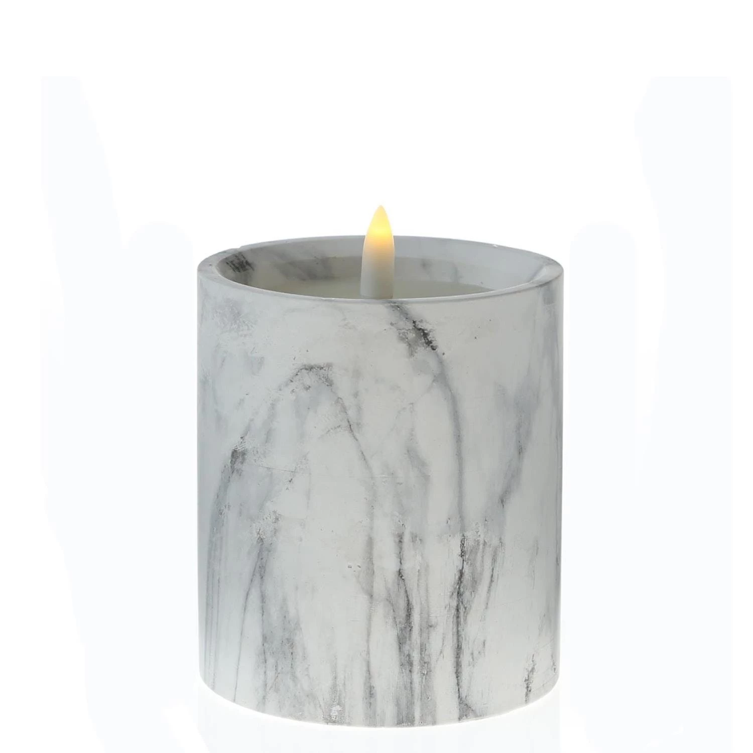 LED Stumpenkerze Flamme – Marmoroptik – Zement/Wachs – natürliche Flamme – Timer – H: 8,5cm – grau