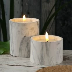Optisch wertvoll präsentiert sich diese LED Kerze mit sehr realistisch aussehender 3D Flamme. Die Kerze ist aus Zement in Marmoroptik gegossen und innen mit Echtwachs gefüllt. Dadurch ist sie besonders schwer und steht sicher.