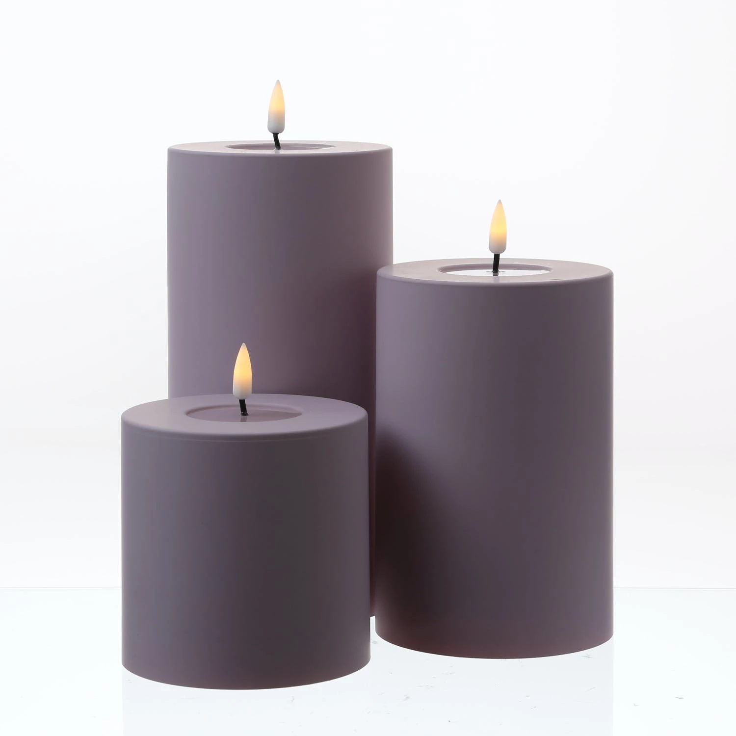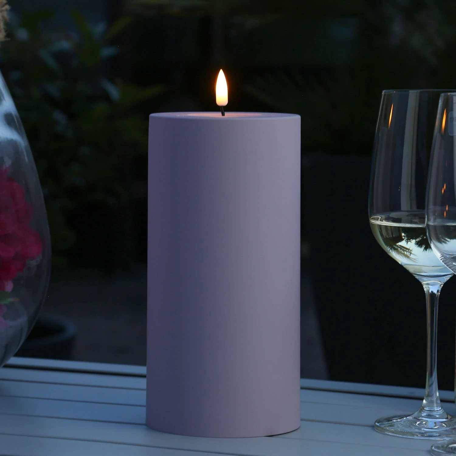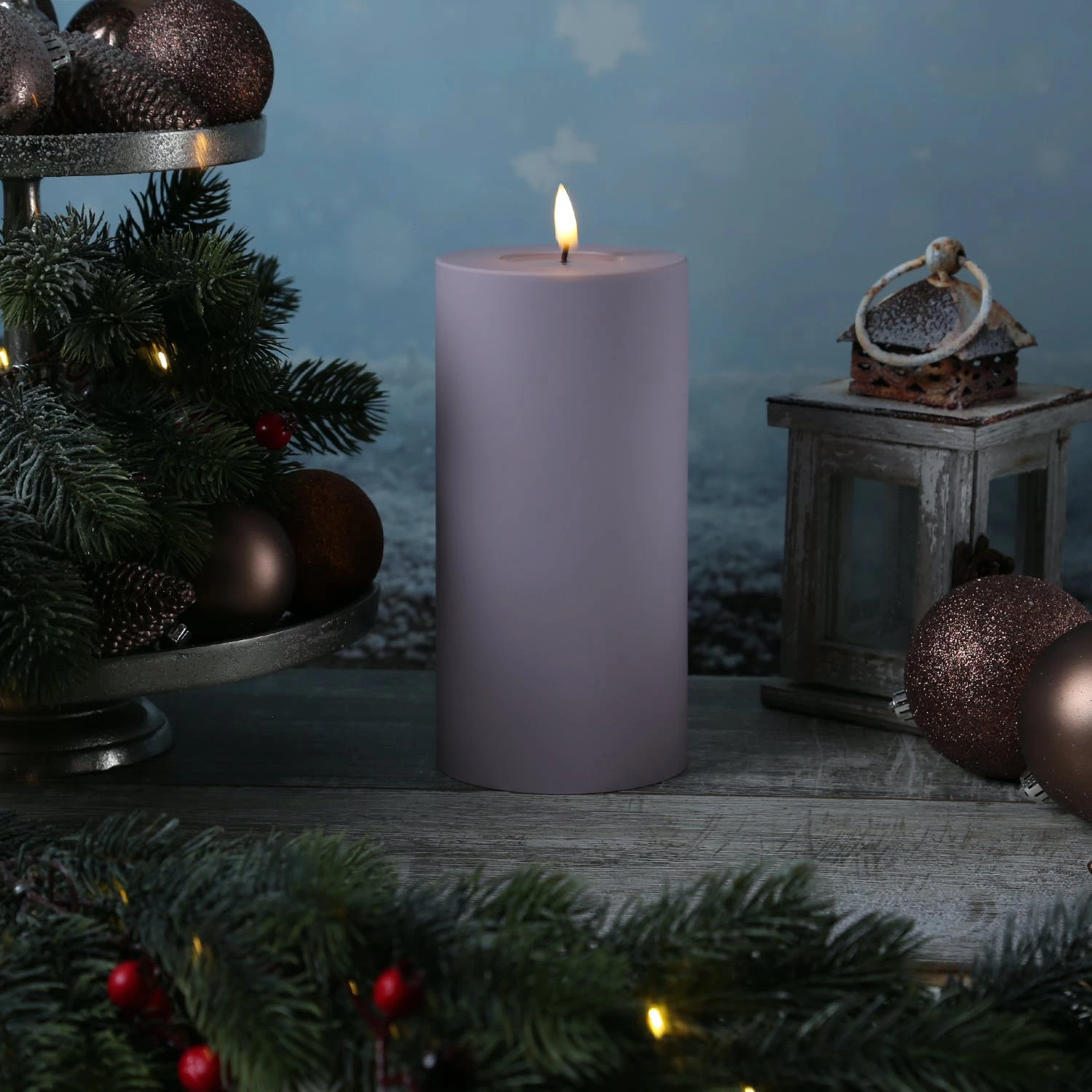 LED Stumpenkerze MIA – Kunststoff – realistische 3D Flamme – H: 20cm – D: 10cm – für Außen – fliederfarben