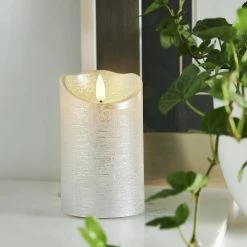 LED Kerze FLAMME – Rustik-Optik – Echtwachs – 3D Flamme – H: 12,5cm – Batterie – Timer – silber