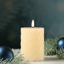 LED Stumpenkerze TWIST – Echtwachs – warmweiĂe 3D Flamme – H: 12,5cm – Batterie – Timer – creme
