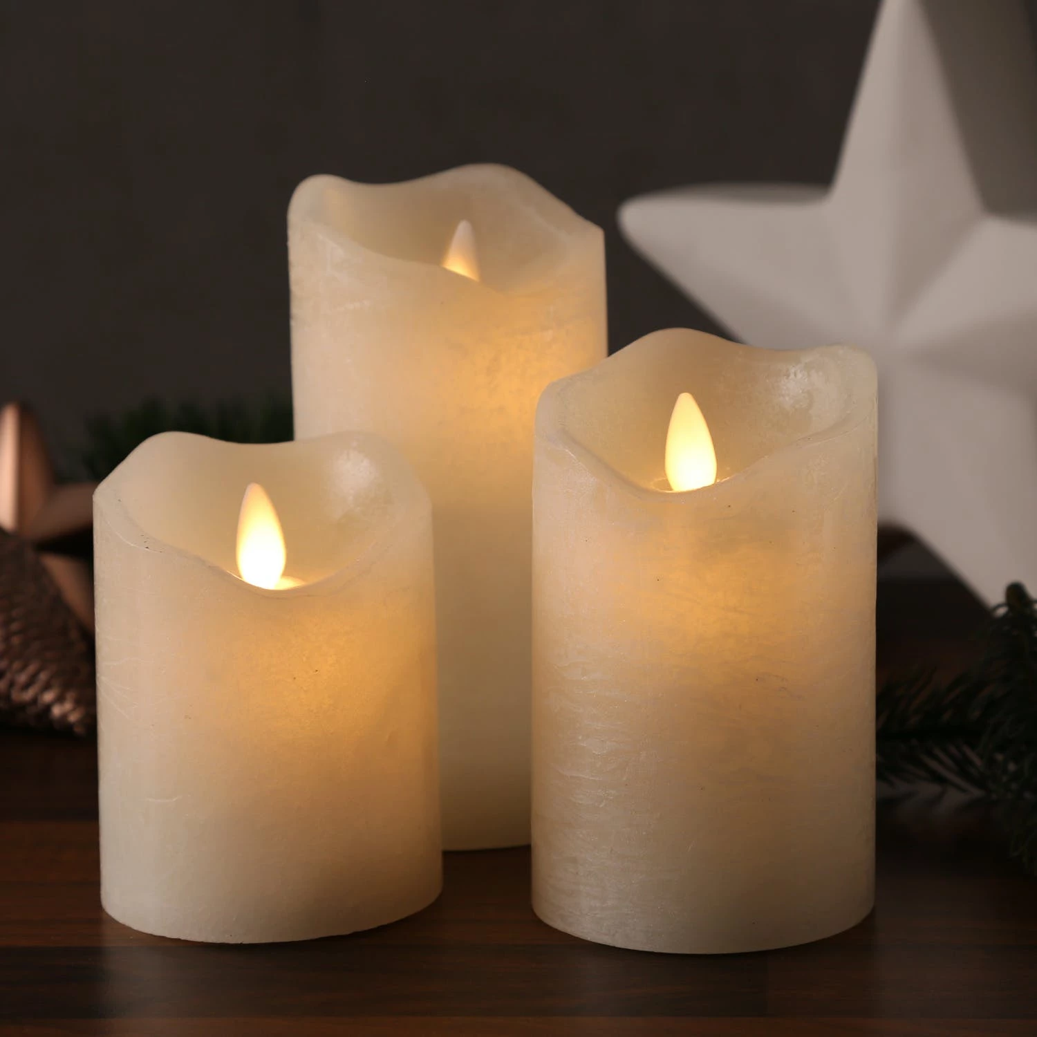 LED Kerzenset M-Twinkle – Echtwachs – bewegte Flamme – 3 Größen – Timer – creme – 3er Set