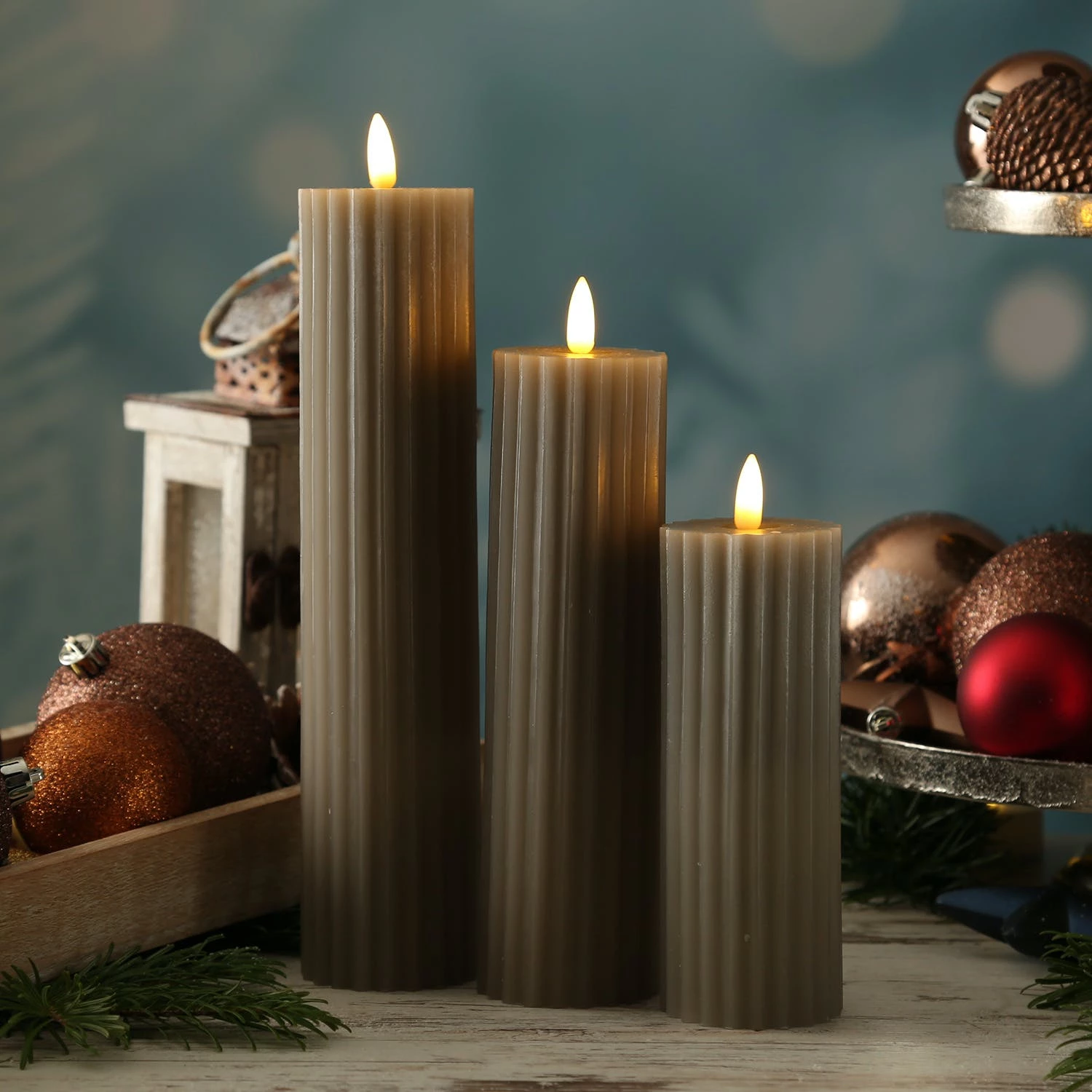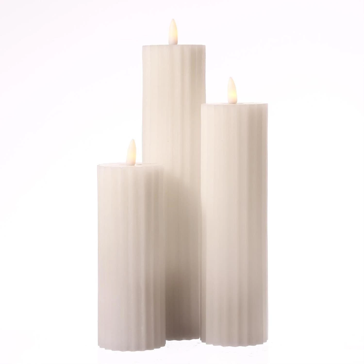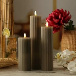 LED Kerzenset LIV – gerillt – Echtwachs – 3D Flamme – 3 Größen – D: 5,5cm – Timer – taupe – 3er Set