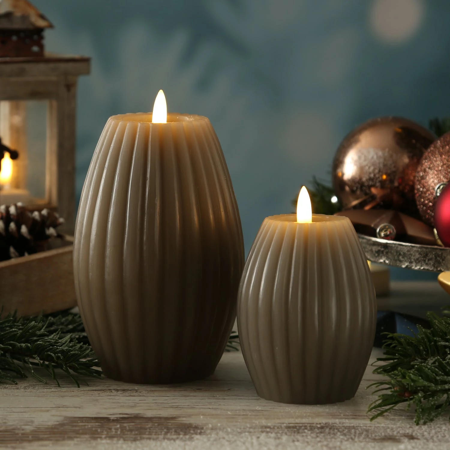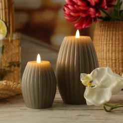 LED Kerzenset LIV – gerillt – Echtwachs – wamrweiße 3D Flamme – 2 Größen – Timer – taupe – 2er Set