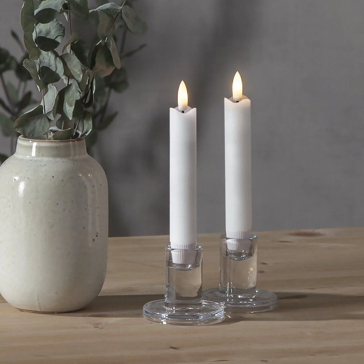 Diese 2 LED Stabkerzen leuchten in einem realistischen gelblich-orangen Farbton. Die 3D Flamme zeigt ein leichtes Flackern, das eine romantische und gemütliche Atmosphäre erzeugt.