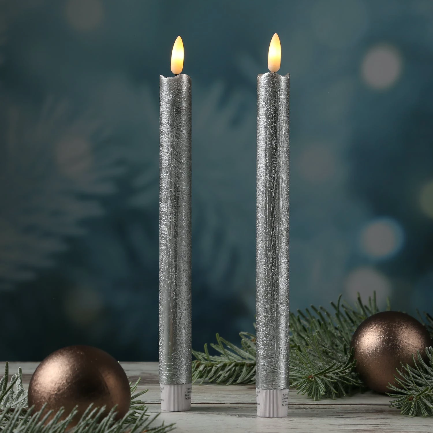 LED Stabkerzen Flamme – Echtwachs – flackernde warmweiĂe LED – H: 25cm – Timer – silber – 2er Set